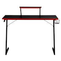 Конструкция простая и прочная: стальная рама выдержит серьезную нагрузку (заявлено до 200 кг). Стол на двух L-образных опорах впишется в любой уголок дома, его легко перемещать, удобно собирать и  разбирать. Несмотря на лаконичность дизайна, он очень стильно смотрится: строгая черная столешница «под карбон» отделана красной кромкой.